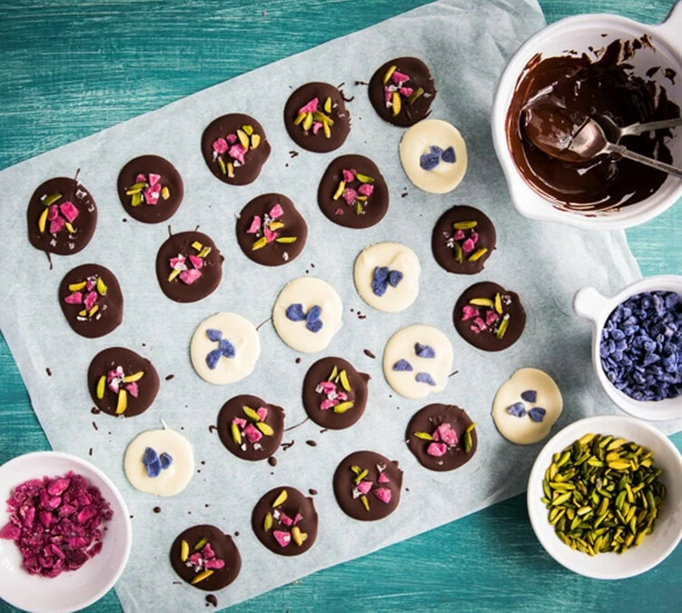 Accompagnez ce café de quelques mendiants faits maison, très faciles à faire. Faites fondre du chocolat au micro-ondes. Avec une cuillère, verser et former un rond de chocolat. Parsemez le de noix, de la noix de coco, des raisins secs, des framboises fraîches. Laissez prendre au frigo et dégustez les avec ce café fort !