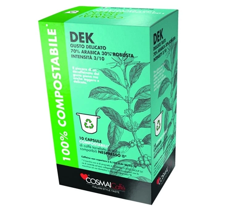Ces 50 capsules compostables Decaffeinato proviennent de la marque Cosmaï Caffé . Recevez 5 boîtes de 10 capsules compatibles Nespresso® d’une intensité douce. Laissez-vous tenter par la qualité de ces capsules Cosmaï Caffé !