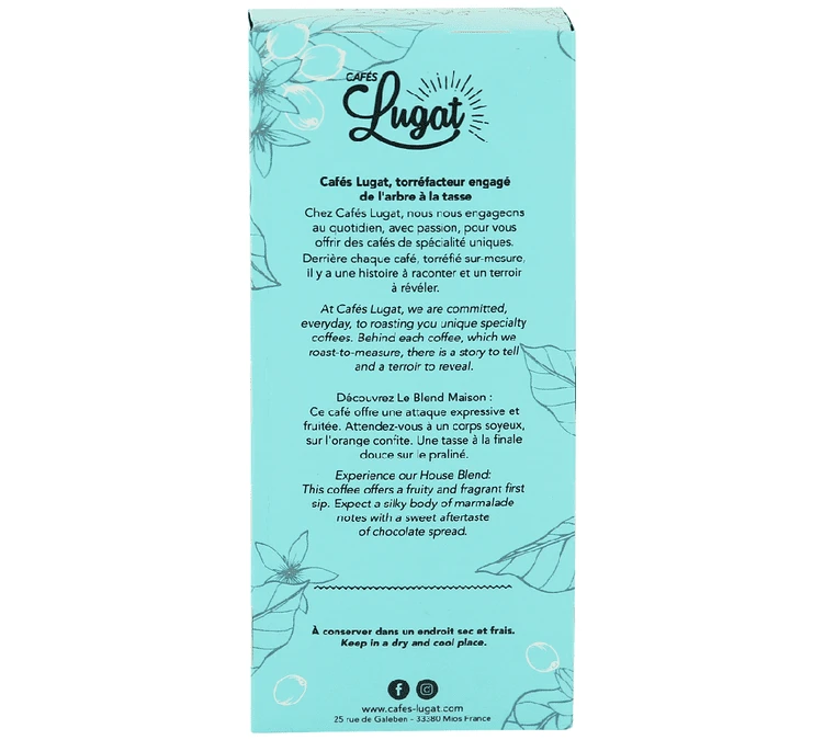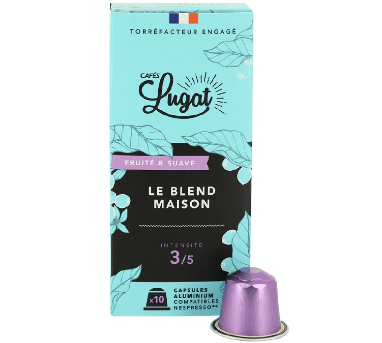 Découvrez Le Blend Maison des Cafés Lugat en capsules compatibles Nespresso®. Ce café gourmand aux notes de fruits jaunes, d’agrumes et d’amandes est un blend d’Arabicas du Brésil, Amérique du Sud et d’Éthiopie. Ce mélange frais et fruité se présente dans des capsules 100% aluminium recyclables pour préserver notre environnement.