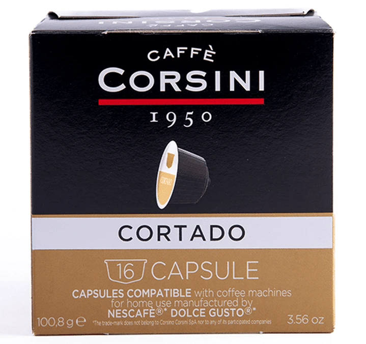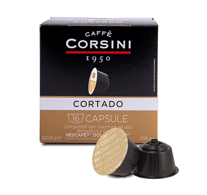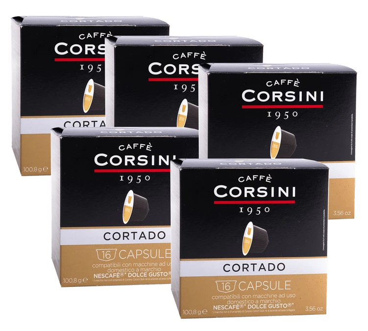 Découvrez ces capsules compatibles Nescafe® Dolce Gusto® Cortado de Caffè Corsini composées de café et de poudre de lait. Vous aurez une boisson lactée qualitative en un rien de temps. Conditionnement : 5 boîtes de 16 capsules. Livraison gratuite !
