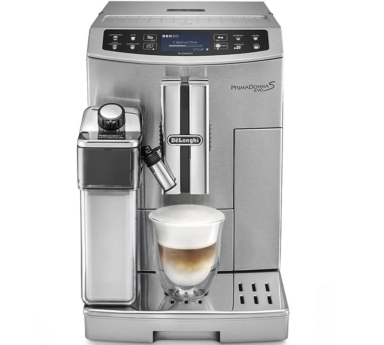 La cafetière à grain Delonghi PrimaDonna S EVO ECAM 510.55.M est un expresso broyeur connecté haut de gamme : lancez votre boisson depuis de votre canapé !