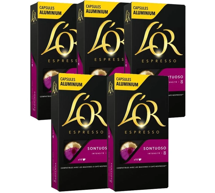 Découvrez les capsules Sontuoso l’Or Espresso compatibles avec les machines compatibles Nespresso®. Cet expresso est composé de notes gourmandes d’amande et de notes florales, surmonté d’une mousse riche et soyeuse. Compatibles Nespresso®. Conditionnement : 5 boîtes de 10 capsules.